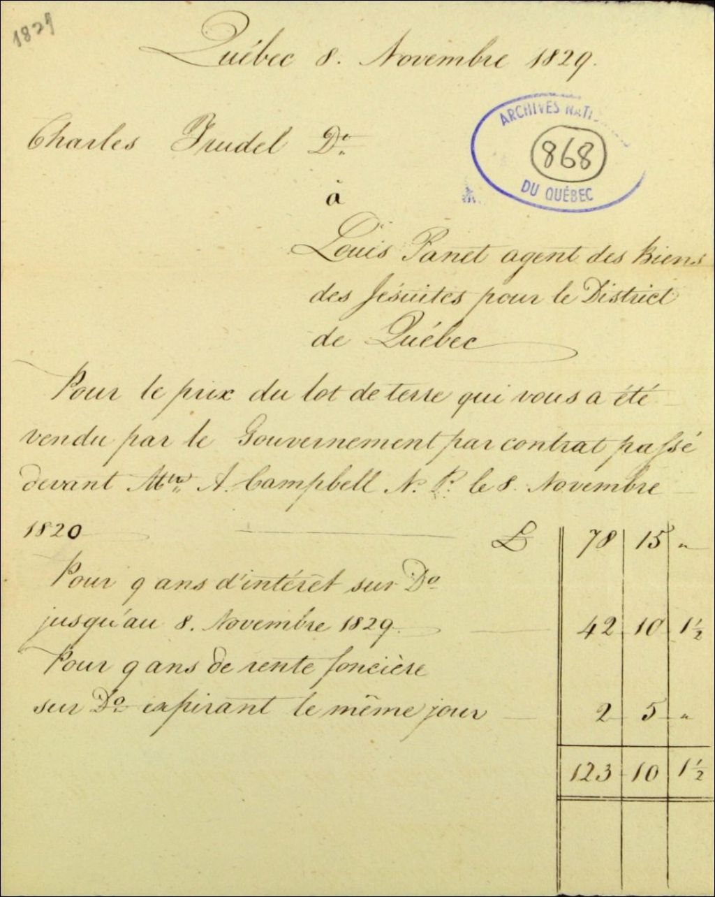 Compte de Charles Trudel, à Louis Panet, agent des biens des Jésuites pour le district de Québec, pour le prix d'achat d'un lot de terre vendu par le gouvernement, 8 novembre 1829, Archives nationales à Québec, Fonds Ministère des Terres et Forêts, (03Q,E21,S64,SS5,SSS3,D868).