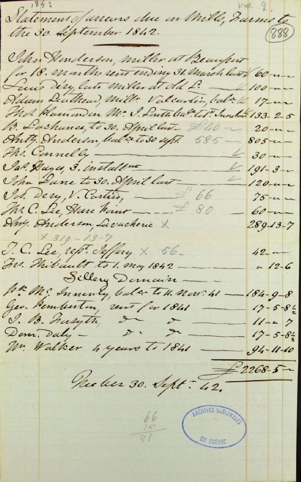 Cédule des arrérages dues sur les moulins et fermes appartenant aux biens des Jésuites dans le district de Québec au 30 septembre 1842, 30 septembre 1842, Archives nationales à Québec, Fonds Ministère des Terres et Forêts, (03Q,E21,S64,SS5,SSS3,D888).