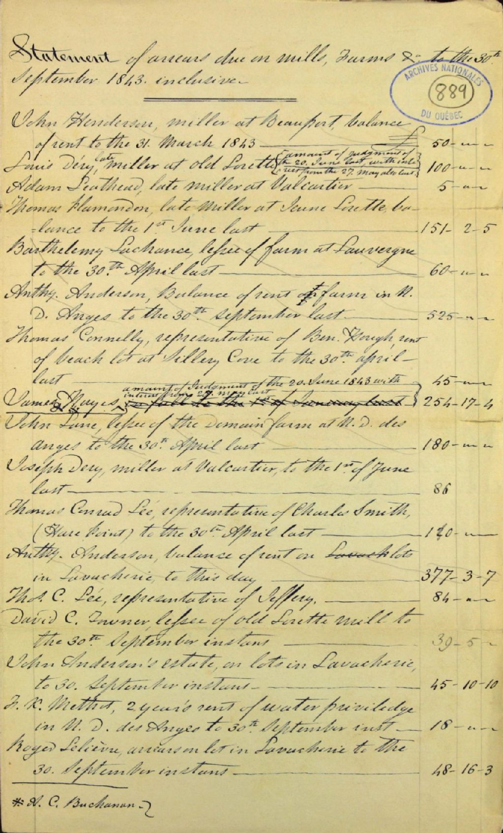 - Cédule des arrérages dues sur les moulins et fermes appartenant aux biens des Jésuites dans le district de Québec au 30 septembre 1843