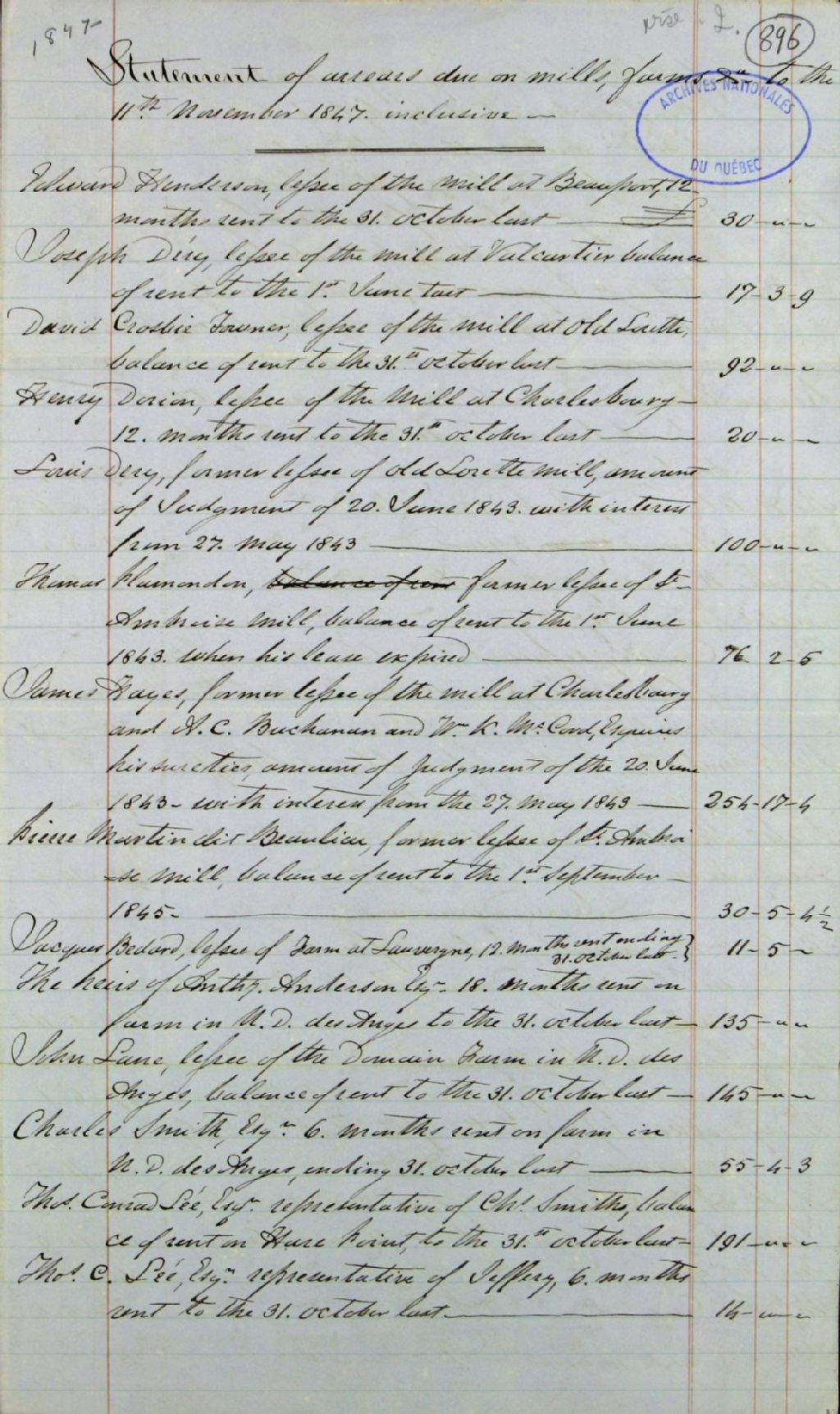 Cédule des arrérages dues sur les moulins et fermes appartenant aux biens des Jésuites dans le district de Québec au 11 novembre 1847