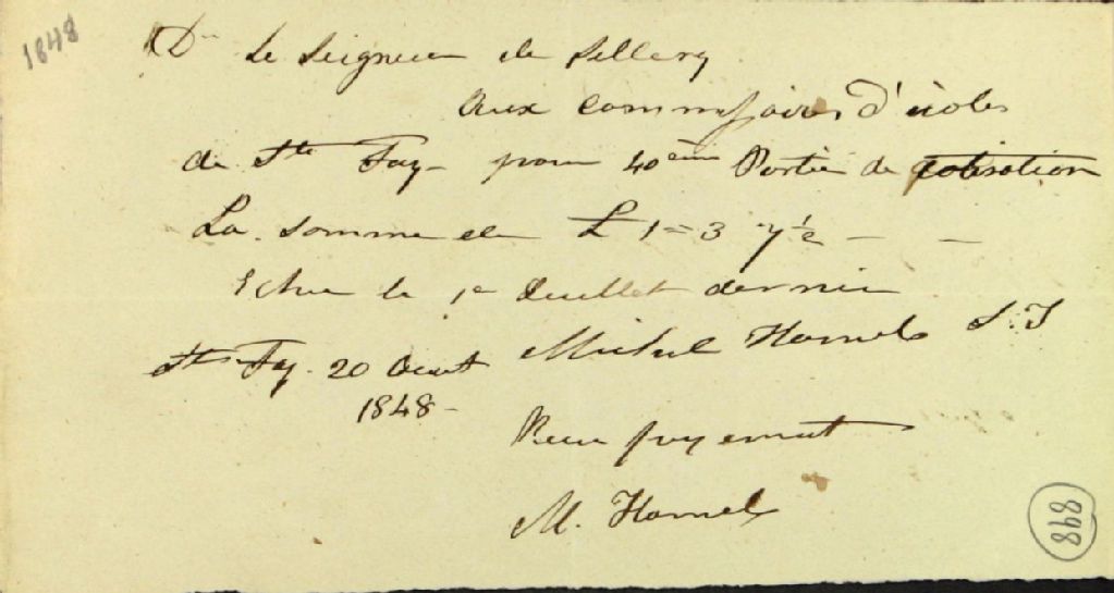 Reçu de Michel Hamel, commisaire d'école de la paroisse de Sainte-Foy de la seigneurie de Sillery, aux commissaires des biens des Jésuites, pour cotisation scolaire, 20 août 1848, Archives nationales à Québec, Fonds Ministère des Terres et Forêts, (03Q,E21,S64,SS5,SSS3,D898).