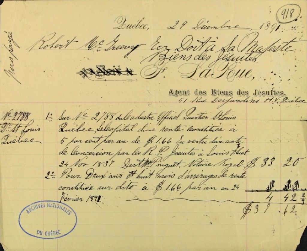 Compte de Robert McGreevy, à F. Larue, agent des biens des Jésuites pour le district de Québec, demeurant au 51 rue des Jardins en la haute-ville de Québec, pour une rente constituée sur un lot de terre situé dans le quartier Saint-Louis de Québec, 29 décembre 1891, Archives nationales à Québec, Fonds Ministère des Terres et Forêts, (03Q,E21,S64,SS5,SSS3,D918).
