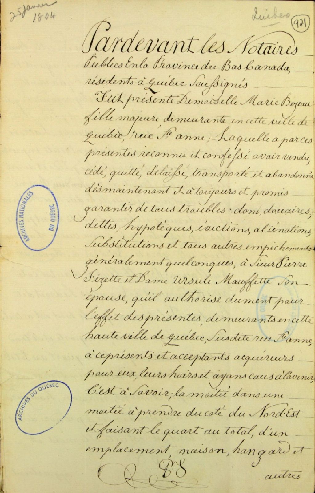 - Vente d'un emplacement situé en la haute-ville de Québec, rue Sainte-Anne ; par Marie Bezeau, fille majeure, de la ville de Québec, rue Sainte-Anne, à Pierre Fiset (Fizette) et Ursule Maufette, son épouse, de la haute-ville de Québec, rue Sainte-Anne