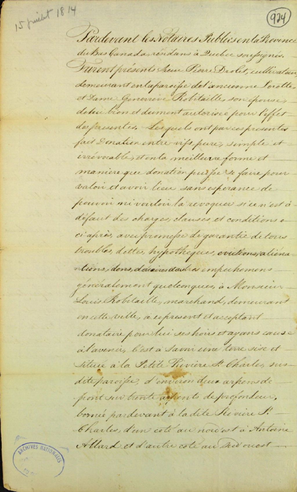Donation d'une terre située à la petite rivière Saint-Charles, paroisse de l'Ancienne-Lorette ; par Pierre Drolet, cultivateur et Geneviève Robitaille, son épouse, de la paroisse de l'Ancienne-Lorette, à Louis Robitaille, marchand, de la ville de Québec, 15 juillet 1814, Archives nationales à Québec, Fonds Ministère des Terres et Forêts, (03Q,E21,S64,SS5,SSS3,D924).