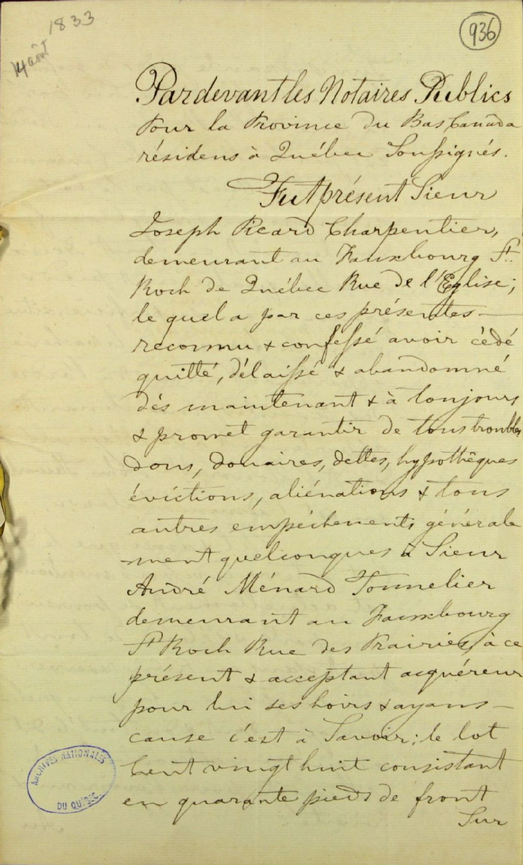 Vent d'un lot de terre situé dans la ferme de la Vacherie ; par Joseph Picard, charpentier, du faubourg Saint-Roch de Québec, rue de l'Église, à André Ménard, tonnelier, du faubourg Saint-Roch, rue des Prairies