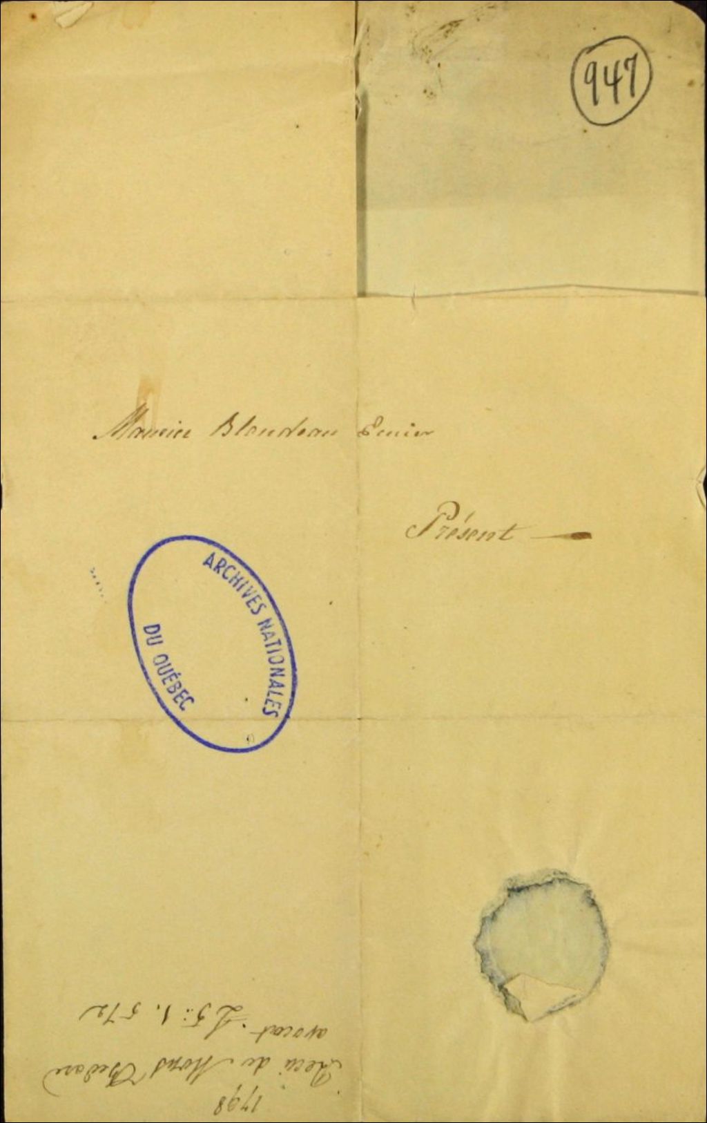 Lettre de Joseph Bédard, avocat, à Maurice Blondeau, pour obtenir des avances de fonds dans la cause du Révérend Père Jean-Joseph Casot, 30 octobre 1798, Archives nationales à Québec, Fonds Ministère des Terres et Forêts, (03Q,E21,S64,SS5,SSS3,D947).