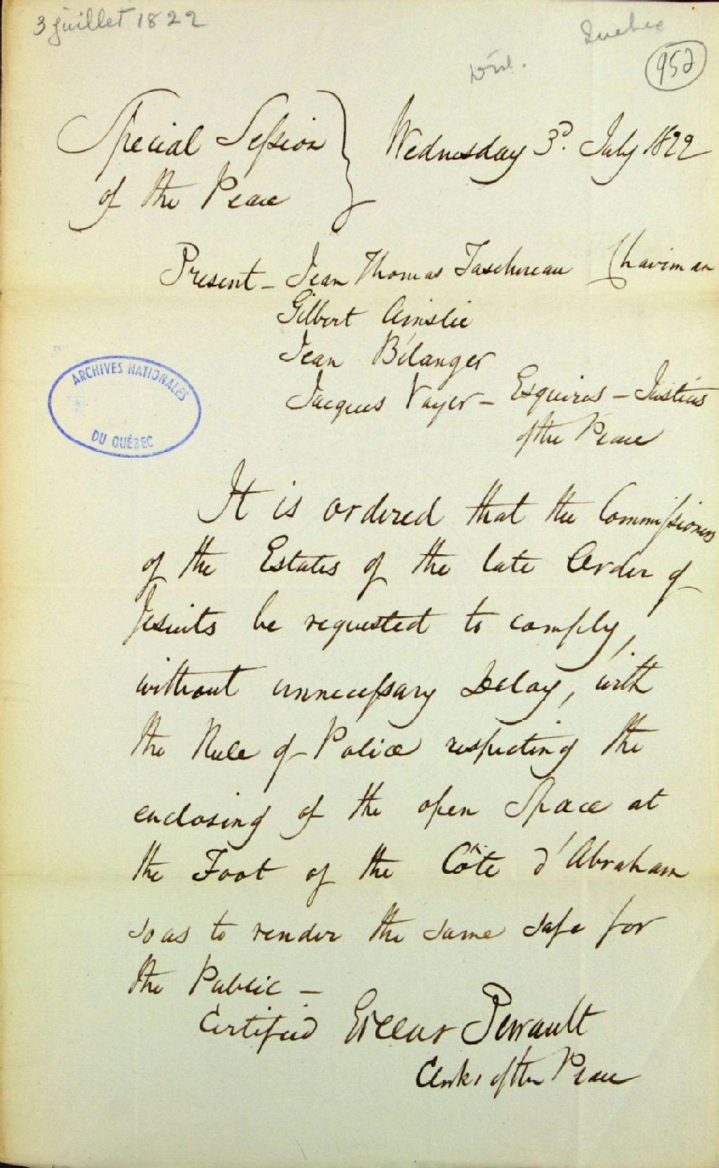 Avis provenant de la Cour des Sessions de la Paix du district de Québec adressé aux commissaires des biens des Jésuites, de clore un espace de terrain situé au pied de la côte d'Abraham, signé Green et Perrault, officiers de la paix, 3 juillet 1822, Archives nationales à Québec, Fonds Ministère des Terres et Forêts, (03Q,E21,S64,SS5,SSS3,D952).