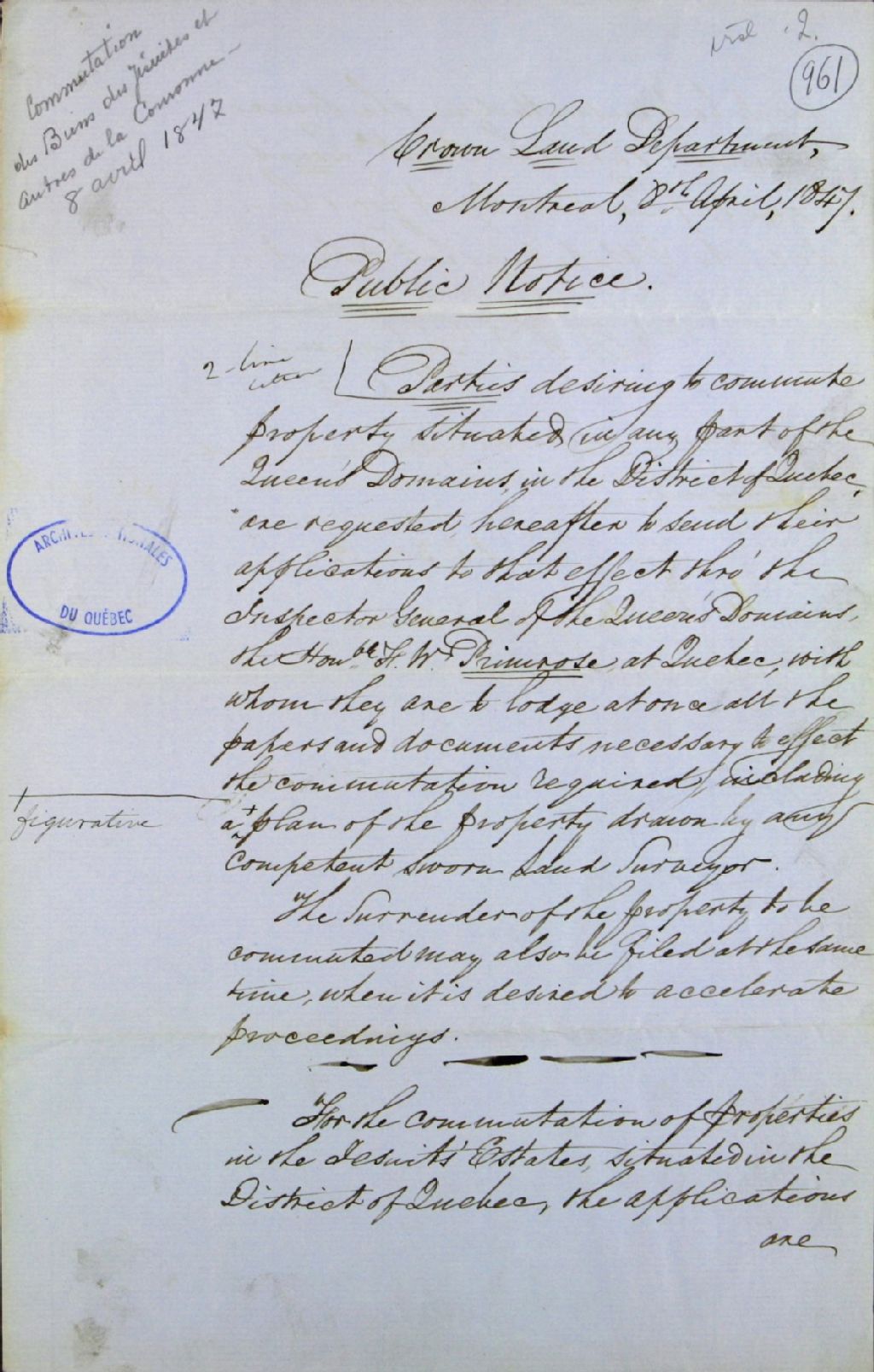 Avis public émanant du département des terres de la Couronne (Montréal) aux propriétaires de terres situées dans le Domaine du roi et dans les biens des Jésuites du district de Québec désirant obtenir une commutation de tenure, 8 avril 1847, Archives nationales à Québec, Fonds Ministère des Terres et Forêts, (03Q,E21,S64,SS5,SSS3,D961).