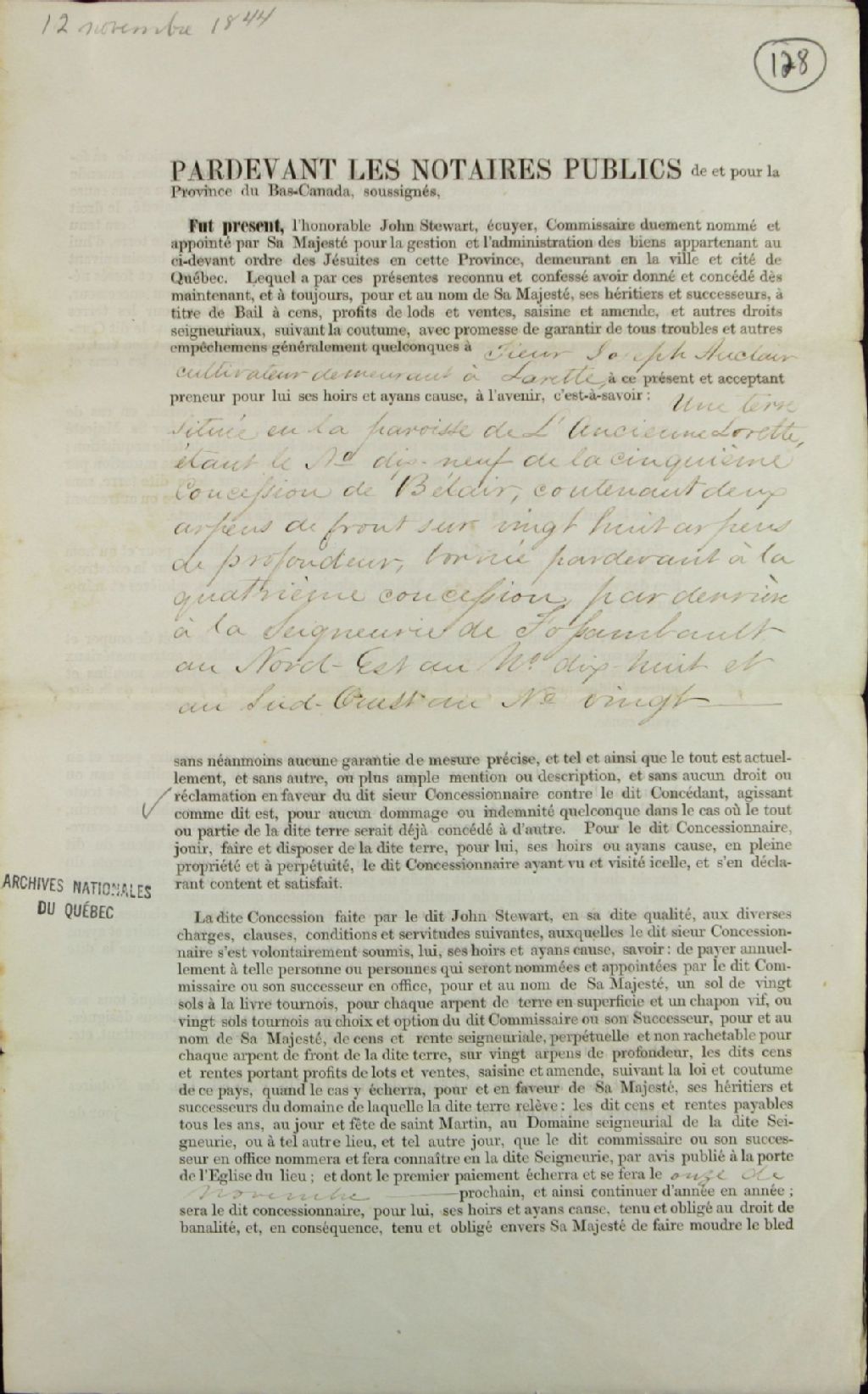 Acte de concession du lot 19 de la cinquième concession de la seigneurie de Bélair, dans la paroisse de l'Ancienne-Lorette dans le comté de Portneuf, par John Stewart, écuyer, membre du Conseil exécutif de la province du Bas-Canada et commissaire des biens des Jésuites, à Joseph Auclair, cultivateur de Lorette, par-devant Louis Panet, notaire public, 12 novembre 1844, Archives nationales à Québec, Fonds Ministère des Terres et Forêts, (03Q,E21,S64,SS5,SSS4,D128).