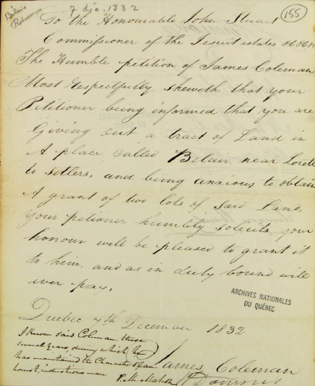 Requête de James Coleman adressée à la commission responsable de l'administration des biens des Jésuites, afin de se faire concéder deux lots dans le fief et seigneurie de Bélair, et note de recommandation de P. McMahon, J. Cannon, John Rowley, John Ficher, John Healy, Charles Brocklesley, William Carter et E. Baird, 7 décembre 1832, Archives nationales à Québec, Fonds Ministère des Terres et Forêts, (03Q,E21,S64,SS5,SSS4,D155).
