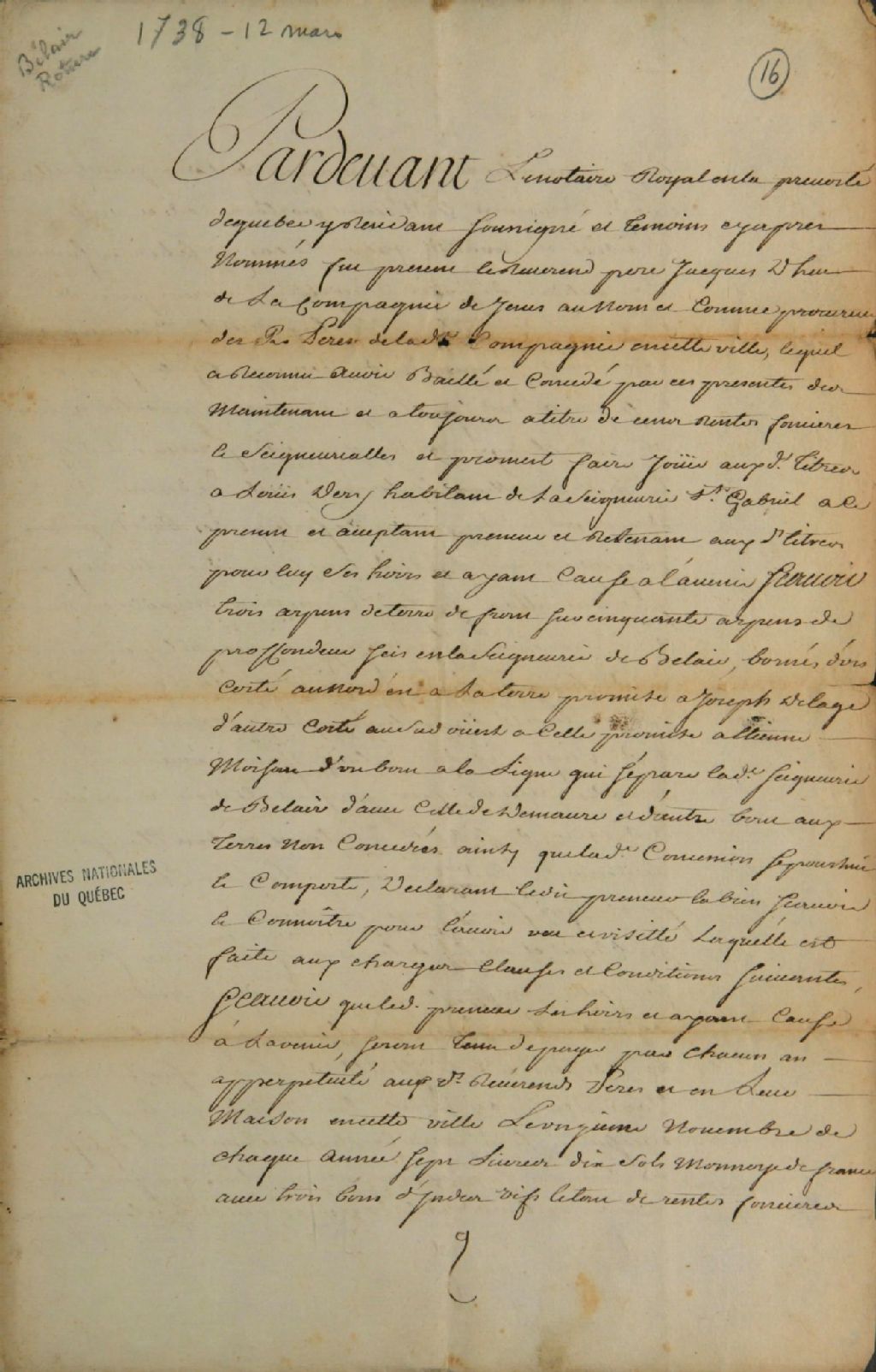 Acte de concession d'une terre située à la seigneurie de Bélair à Louis Déry, habitant de la seigneurie Saint-Gabriel, par les Révérends Pères Jésuites, par-devant Pinguet, notaire royal, 12 mars 1738, Archives nationales à Québec, Fonds Ministère des Terres et Forêts, (03Q,E21,S64,SS5,SSS4,D16).