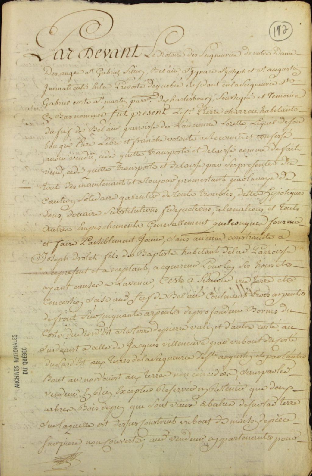 Acte de vente d'une terre située dans la seigneurie de Bélair, par Pierre Charron de la paroisse de l'Ancienne-Lorette, fief de Bélair, à Joseph Drolet (Drollette, Drolette, Drollet), fils de Baptiste, habitant de la même paroisse, par-devant André Genest, notaire royal, 6 juillet 1755, Archives nationales à Québec, Fonds Ministère des Terres et Forêts, (03Q,E21,S64,SS5,SSS4,D172).