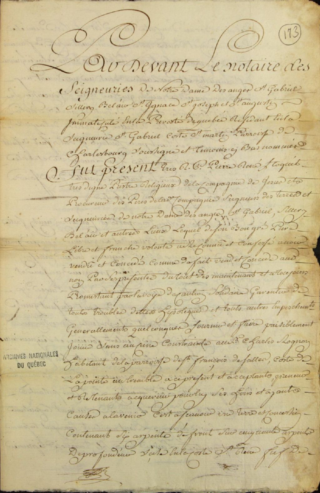 - Acte de concession et de vente d'une terre située à la côte Saint-René dans le fief de Bélair, par les Révérends Pères Jésuites à Charles Rognon, de la paroisse Saint-François-de-Sales, côte de Pointe-aux-Trembles, par-devant André Genest, notaire royal