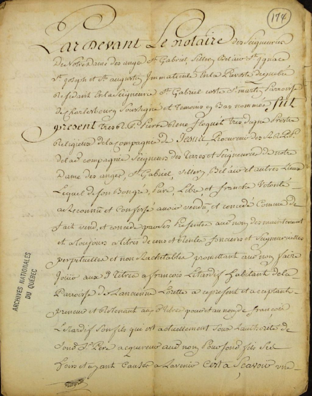 - Acte de vente et concession d'une terre située à côte Saint-René dans le fief Bélair, par les Révérends Pères Jésuites à François Letardif (Tardif) père, habitant de l'Ancienne-Lorette, au nom de François Letardif (Tardif) son fils, par-devant André Genest, notaire royal