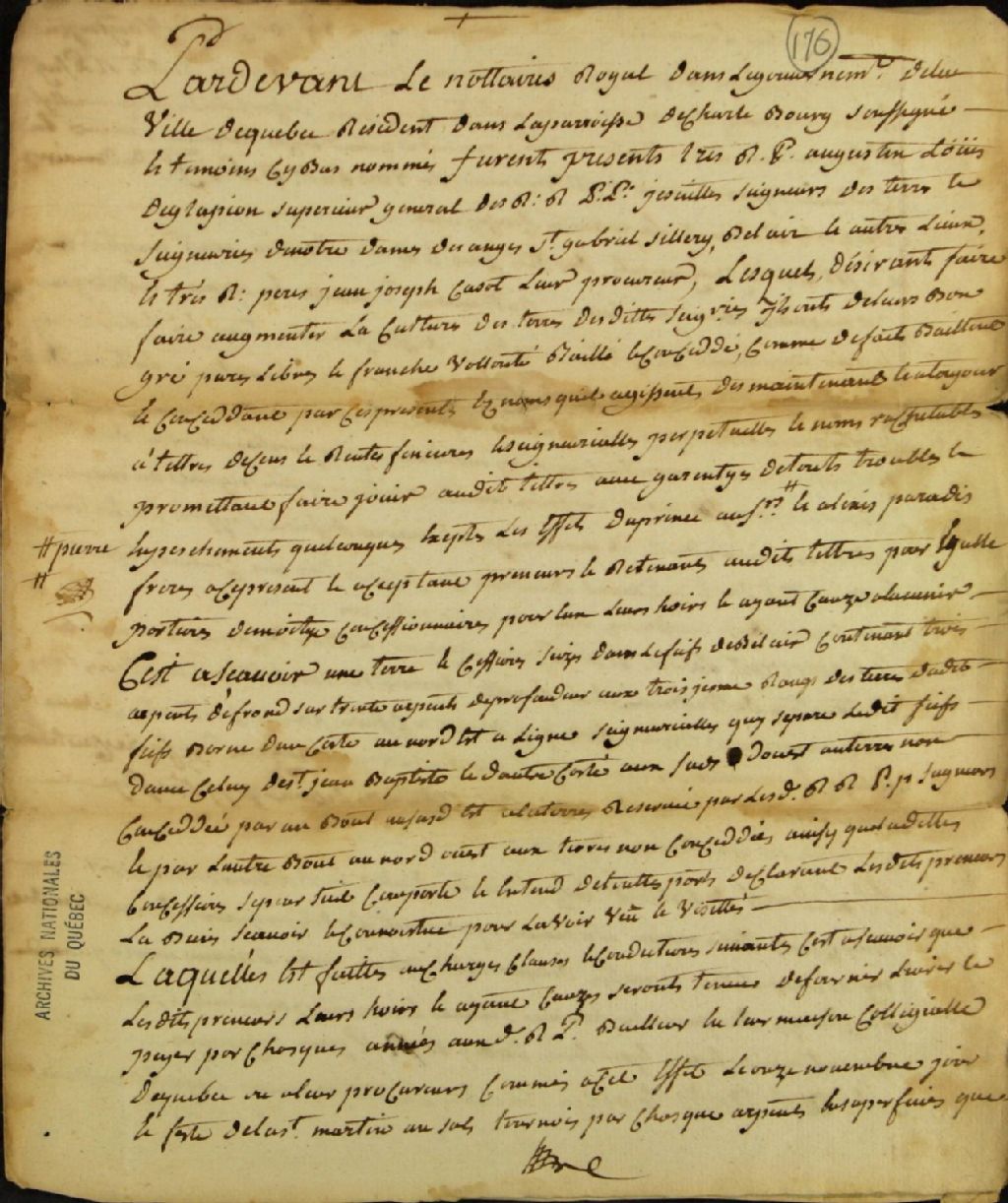 Acte de concession d'une terre située à la seigneurie de Bélair, par les Révérends Pères Jésuites à Pierre Paradis et Alexis Paradis, frères, par-devant André Genest, notaire royal, 3 mars 1774, Archives nationales à Québec, Fonds Ministère des Terres et Forêts, (03Q,E21,S64,SS5,SSS4,D176).