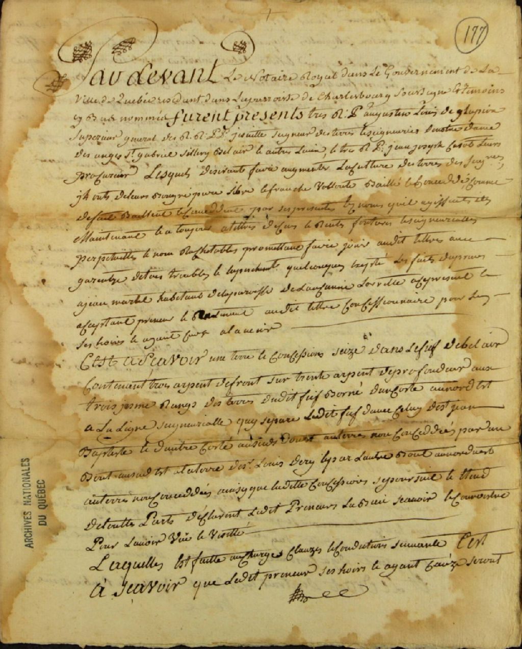 Acte de concession d'une terre située à la seigneurie de Bélair, par les Révérends Pères Jésuites à Jean Martel, habitant de la paroisse de l'Ancienne-Lorette, par-devant André Genest, notaire royal, 22 mars 1774, Archives nationales à Québec, Fonds Ministère des Terres et Forêts, (03Q,E21,S64,SS5,SSS4,D177).