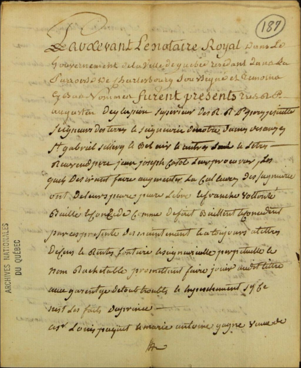 - Acte de concession d'une terre située à la côte Beauséjour dans la seigneurie de Bélair, par les Révérends Pères Jésuites à Louis Paquet (Paquette) et Marie-Antoine Gagné, veuve de Charles Marié (Lemarié), habitant de l'Ancienne-Lorette, par-devant André Genest, notaire royal