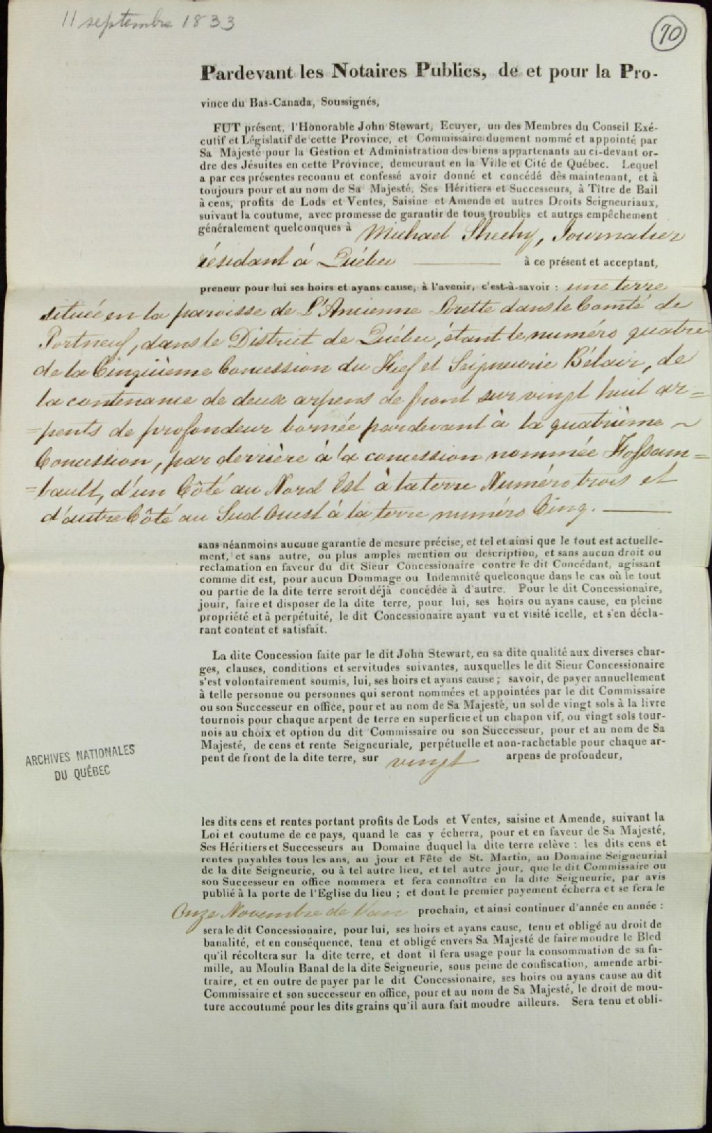 Acte de concession du lot 14 de la cinquième concession de la seigneurie de Bélair, dans la paroisse de l'Ancienne-Lorette dans le comté de Portneuf, par John Stewart, écuyer, membre du Conseil exécutif de la province du Bas-Canada et commissaire des biens des Jésuites, à Michael Sheehy (?), journalier de Québec, par-devant Archibald Campbell, notaire public, 11 septembre 1833, Archives nationales à Québec, Fonds Ministère des Terres et Forêts, (03Q,E21,S64,SS5,SSS4,D70).