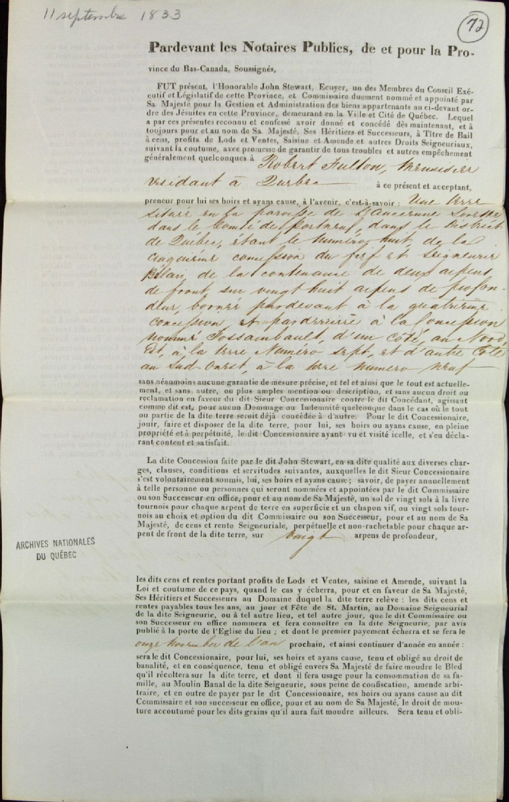 Acte de concession du lot 8 de la cinquième concession de la seigneurie de Bélair, dans la paroisse de l'Ancienne-Lorette dans le comté de Portneuf, par John Stewart, écuyer, membre du Conseil exécutif de la province du Bas-Canada et commissaire des biens des Jésuites, à Robert Fullon, menuisier de Québec, par-devant par-devant Archibald Campbell, notaire public, 11 septembre 1833, Archives nationales à Québec, Fonds Ministère des Terres et Forêts, (03Q,E21,S64,SS5,SSS4,D72).