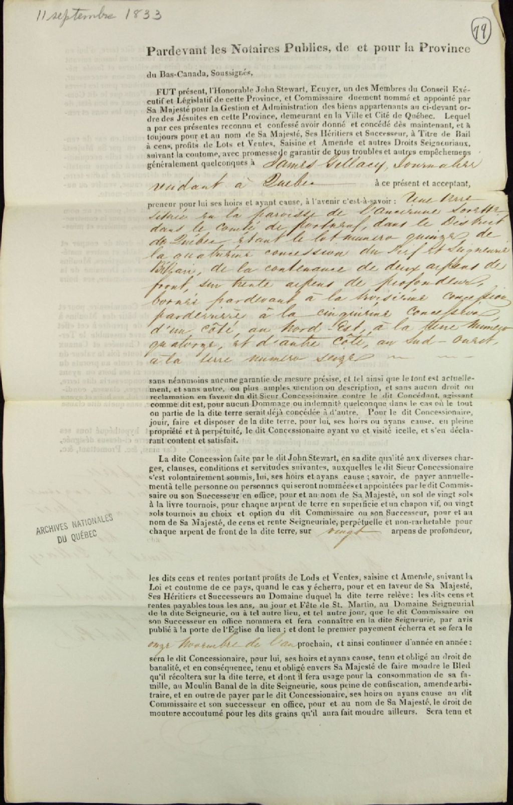 Acte de concession du lot 15 de la quatrième concession de la seigneurie de Bélair, dans la paroisse de l'Ancienne-Lorette, comté de Portneuf, par John Stewart, écuyer, membre du Conseil exécutif de la province du Bas-Canada et commissaire des biens des Jésuites, à James Gillacy, journalier de Québec, par-devant Archibald Campbell, notaire public, 11 septembre 1833, Archives nationales à Québec, Fonds Ministère des Terres et Forêts, (03Q,E21,S64,SS5,SSS4,D79).