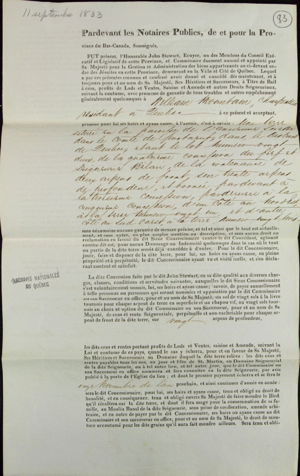 Acte de concession du lot 22 de la quatrième concession de la seigneurie de Bélair, dans la paroisse de l'Ancienne-Lorette dans le comté de Portneuf, par John Stewart, écuyer, membre du Conseil exécutif de la province du Bas-Canada et commissaire des biens des Jésuites, à William Mountain, charpentier de Québec, par-devant Archibald Campbell, notaire public, 11 septembre 1833, Archives nationales à Québec, Fonds Ministère des Terres et Forêts, (03Q,E21,S64,SS5,SSS4,D83).