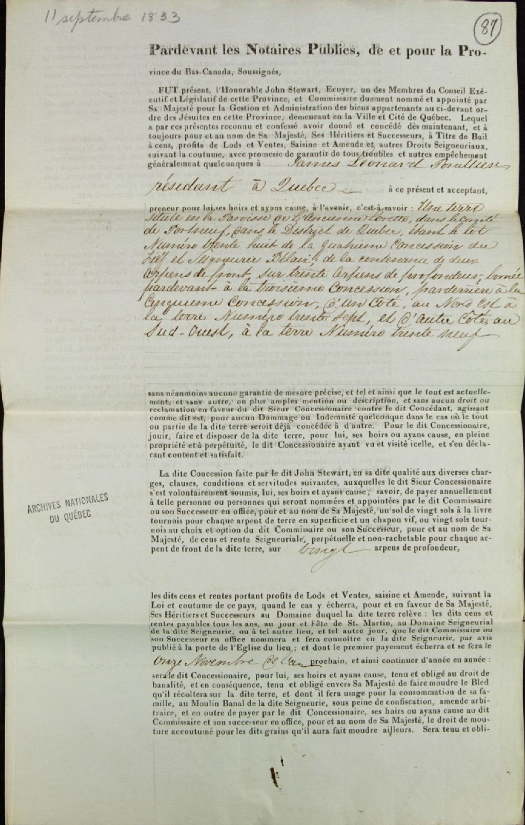 Acte de concession du lot 38 de la quatrième concession de la seigneurie de Bélair, dans la paroisse de l'Ancienne-Lorette dans le comté de Portneuf, par John Stewart, écuyer, membre du Conseil exécutif de la province du Bas-Canada et commissaire des biens des Jésuites, à James Leonard, tonnelier de Québec, par-devant Archibald Campbell, notaire public, 11 septembre 1833, Archives nationales à Québec, Fonds Ministère des Terres et Forêts, (03Q,E21,S64,SS5,SSS4,D87).