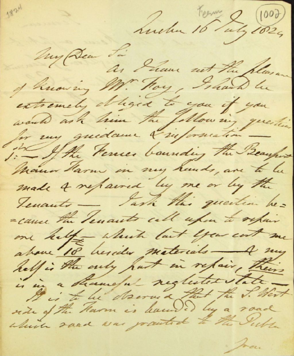 Lettre du colonel Ralph Gore à Herman W. Ryland, afin de connaître l'avis de Lewis Foy [de la Commission des biens des Jésuites] concernant des réparations à faire à la ferme du manoir de Beauport et certains droits du meunier de Charlesbourg, 16 juillet 1824, Archives nationales à Québec, Fonds Ministère des Terres et Forêts, (03Q,E21,S64,SS5,SSS5,D1002).