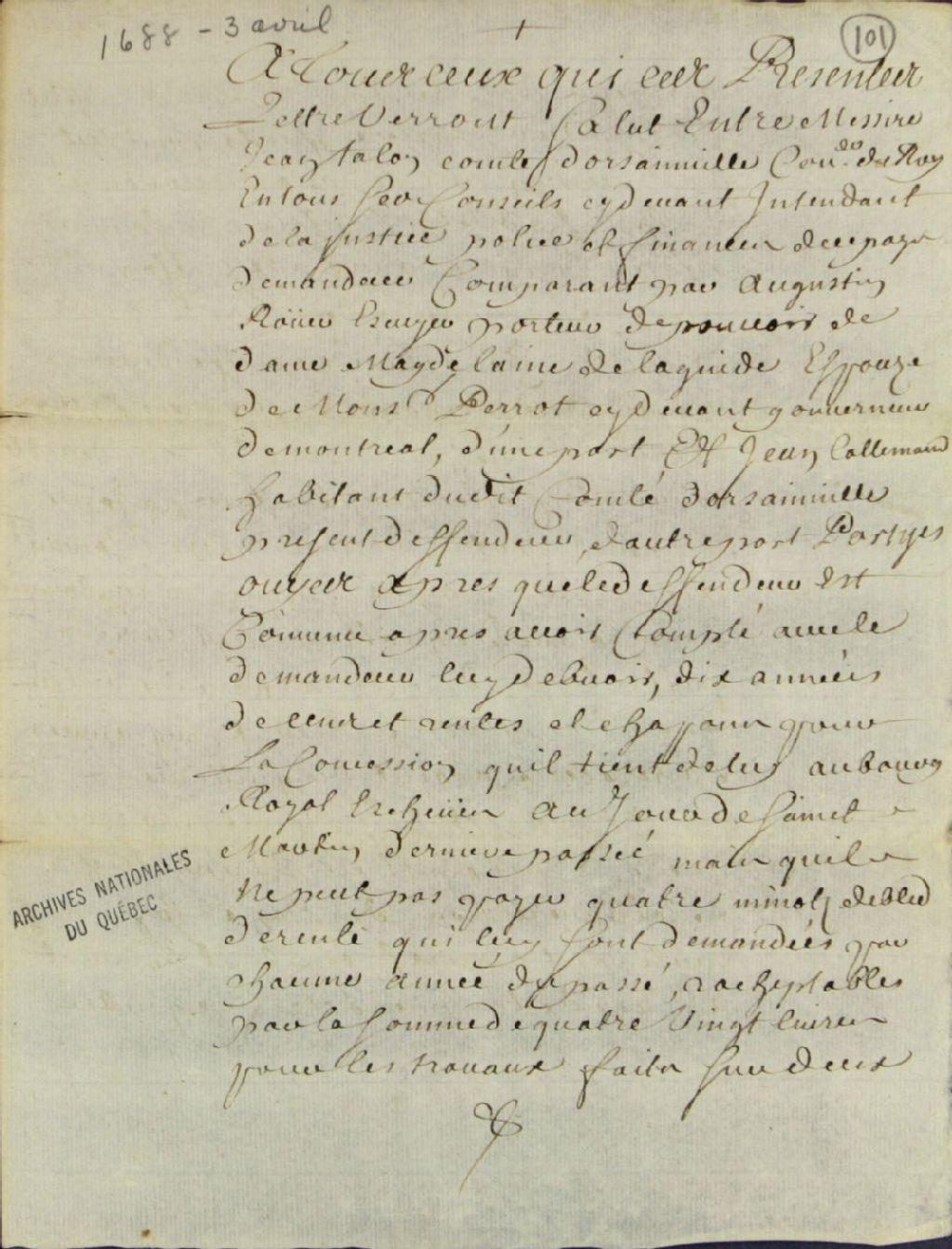 Jugement rendu en faveur de messire Jean Talon, comte d'Orsainville, conseiller du Roi en ses Conseils, ci-devant intendant de justice, police et finances, comparant par Augustin Rouer, écuyer, porteur du pouvoir de dame Madeleine Laguide, épouse de monsieur Perrault (Perrot), ci-devant gouverneur de Montréal, par René-Louis Chartier, écuyer, seigneur de Lotbinière, conseiller du Roi et son lieutenant général civil et criminel au siège de la Prévôté de Québec, dans la cause concernant le non paiement des cens et rente d'une habitation située au Bourg-Royal l'opposant à Jean Lallemand, habitant du comté d'Orsainville