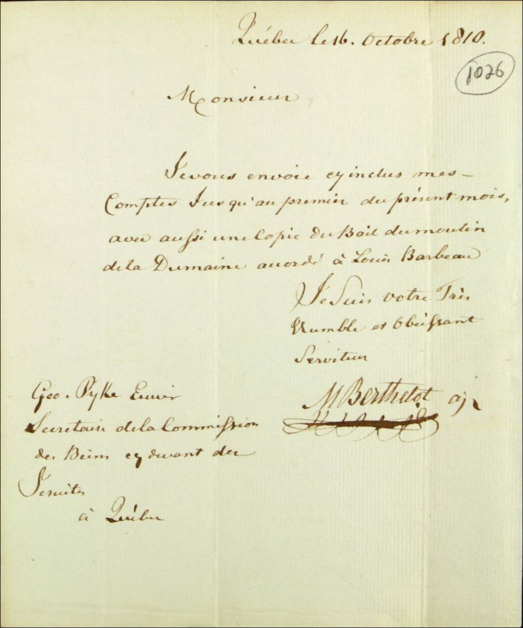 Lettre de Michel Berthelot, agent des biens des Jésuites, à George Pyke, écuyer et secrétaire de la Commission des biens des Jésuites, qui présente ses comptes et une copie du bail du moulin de la Dumaine accordé à Louis Barbeau, 16 octobre 1810, Archives nationales à Québec, Fonds Ministère des Terres et Forêts, (03Q,E21,S64,SS5,SSS5,D1026).