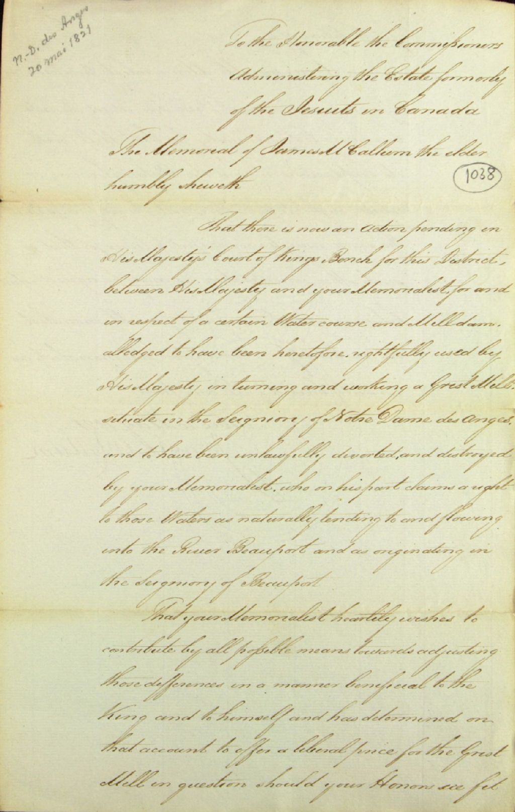 Mémoire de James McCallum à la commission responsable de l'administration des biens des Jésuites, concernant la poursuite en justice devant la Cour du banc du roi du district de Québec entre Sa Majesté, demandeur, et James McCallum, défendeur, relative à l'utilisation d'un cours d'eau et d'un barrage par un moulin de la seigneurie Notre-Dame-des-Anges. McCallum offre à la commission cent livres courantes pour le moulin et le cours d'eau qui le dessert, 20 mai 1821, Archives nationales à Québec, Fonds Ministère des Terres et Forêts, (03Q,E21,S64,SS5,SSS5,D1038).