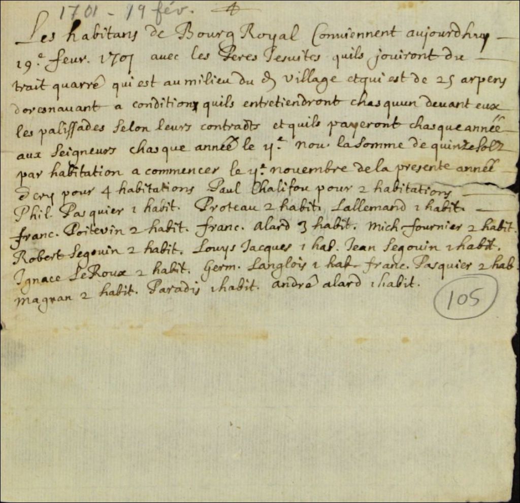 Convention entre les habitants du Bourg-Royal et les Pères Jésuites à l'effet que lesdits habitants jouiront du trait-carré qui est au milieu de leur village à condition qu'ils entretiennent tous selon leur contrat les palissades devant leur(s) habitation(s) et qu'ils paient chaque année aux seigneurs la somme de quinze sols par habitation, 19 février 1701, Archives nationales à Québec, Fonds Ministère des Terres et Forêts, (03Q,E21,S64,SS5,SSS5,D105).
