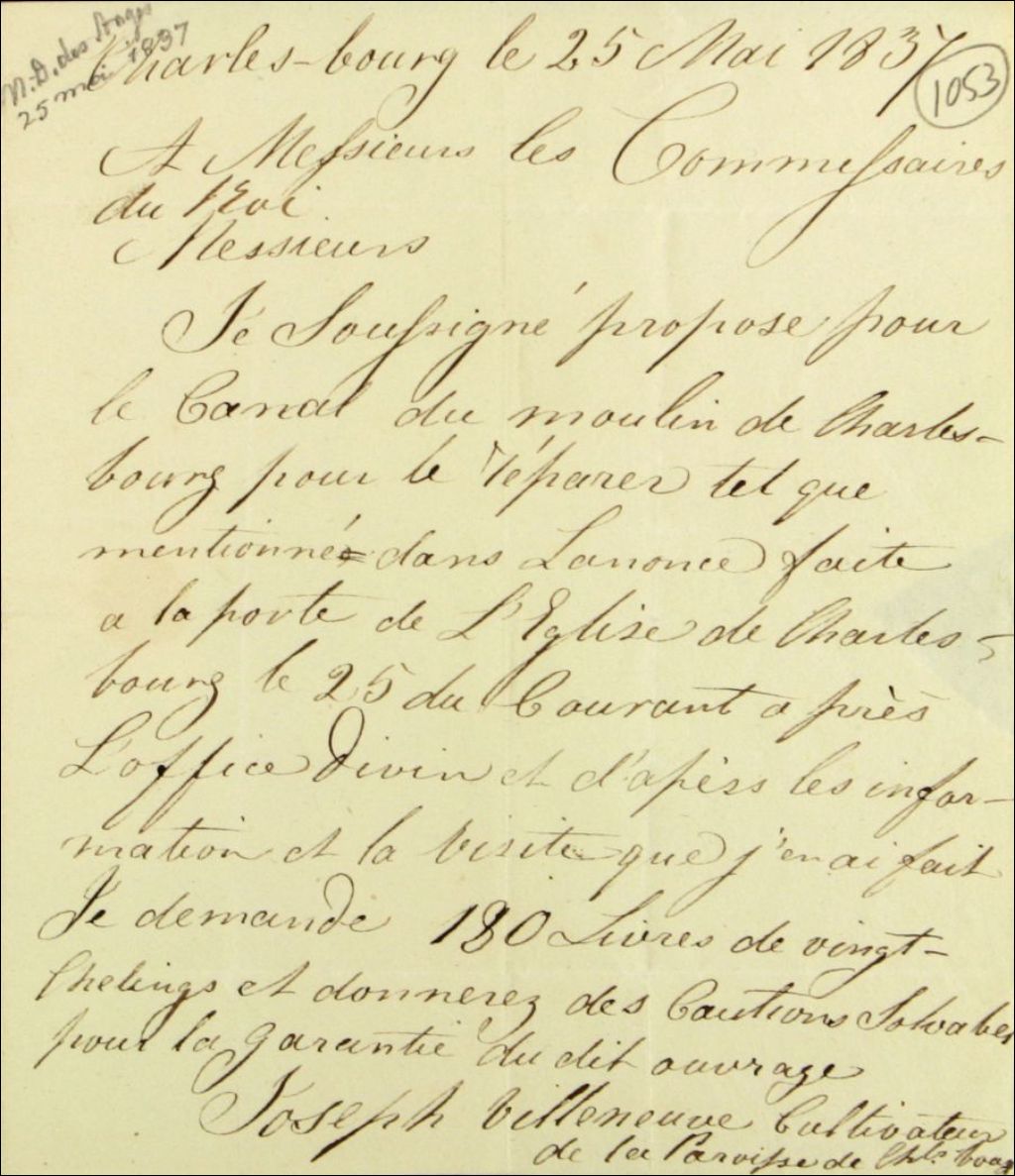 Lettre de Joseph Villeneuve, cultivateur de Charlesbourg, à John Stuart, commissaire des biens des Jésuites, qui propose ses services afin d'effectuer les réparations au moulin de Charlesbourg, 25 mai 1837, Archives nationales à Québec, Fonds Ministère des Terres et Forêts, (03Q,E21,S64,SS5,SSS5,D1053).