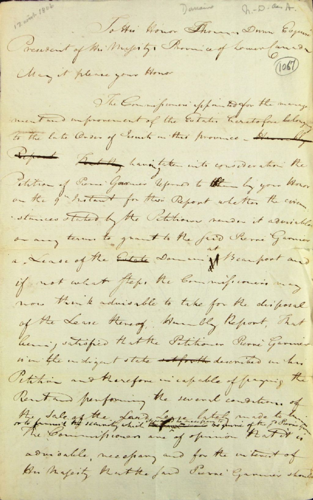 Brouillon d'un rapport non signé destiné à Thomas Dunn, écuyer et président du Conseil exécutif du Bas-Canada, concernant la pétition (requête) de Pierre Garnier adressée à la Commission des biens des Jésuites, afin d'obtenir un bail sur une ferme du domaine à Beauport, 12 août 1806, Archives nationales à Québec, Fonds Ministère des Terres et Forêts, (03Q,E21,S64,SS5,SSS5,D1067).