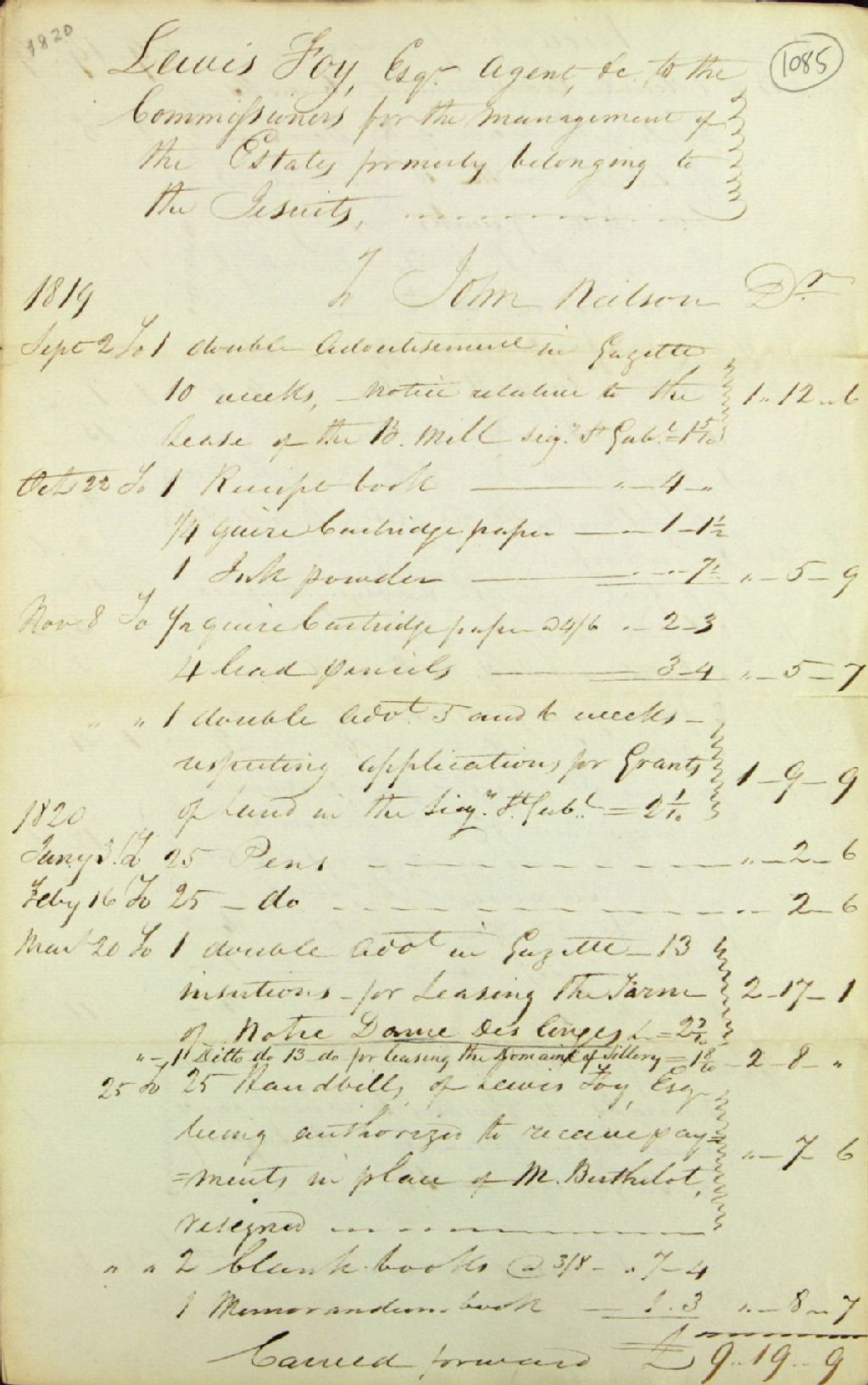État de compte pour des frais d'impression de Lewis Foy, écuyer et agent de la Commission des biens des Jésuites, dus à John Neilson, après le 19 septembre 1820, Archives nationales à Québec, Fonds Ministère des Terres et Forêts, (03Q,E21,S64,SS5,SSS5,D1085).