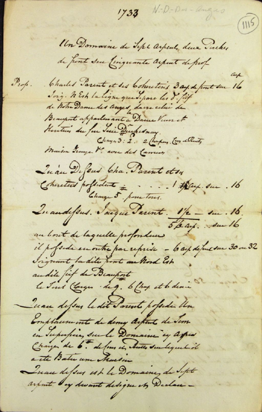 Liasse comprenant des chaînes de titres et des brouillons d'actes notariés relatifs en particulier aux familles Parent, Lachaine (Lachesne) et aux Bouin dans la seigneurie Notre-Dame-des-Anges, mentionnant entre autres la route Saint-Paul et le Domaine, 1er janvier 1733 - 8 juillet 1764, Archives nationales à Québec, Fonds Ministère des Terres et Forêts, (03Q,E21,S64,SS5,SSS5,D1115-1118).