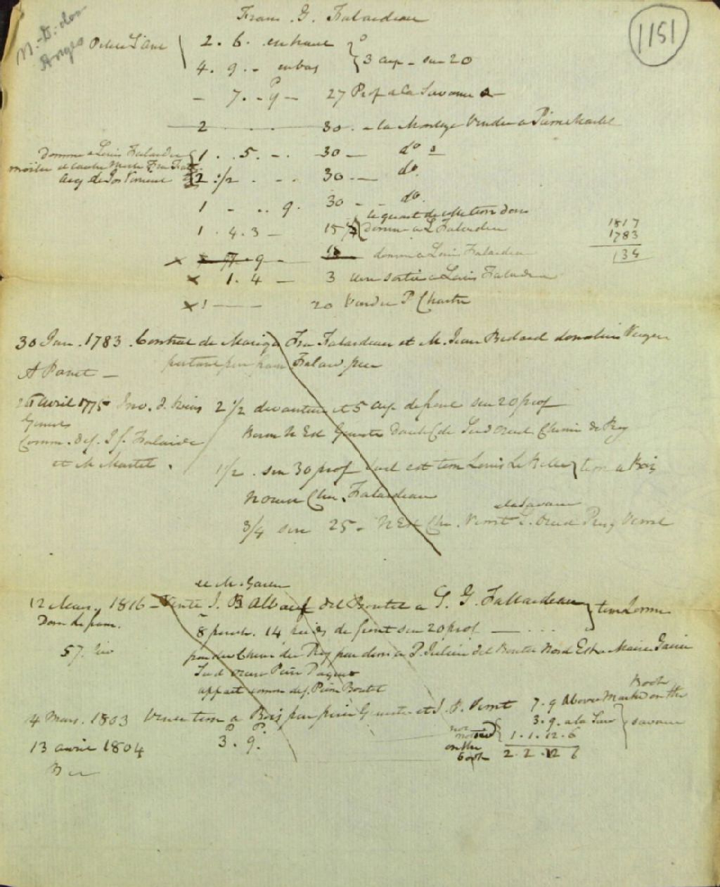 - Liasse de documents non signés ou provenant des notaires Lelièvre, Boudreault et Campbell, comprenant des brouillons de listes de transactions foncières, de calculs de cens et rentes, de chaînes de titres et d'actes notariés, relatifs en particulier aux familles Falardeau, Bédard, Villeneuve, Paquet (Paquette), Pépin, Savard de la côte Saint-Antoine, Dubeau, Parent du Bourg-Royal, Toupin, Pageot (Pajot) de Charlesbourg, L'Heureux, Boutet, Léonard (Linéard), Jobin, Auclair, Trudel, Renaud, Boulanger de la montagne des Ormes, Magnan, dont certains sont identifiés aux seigneuries Notre-Dame-des-Anges et Saint-Gabriel