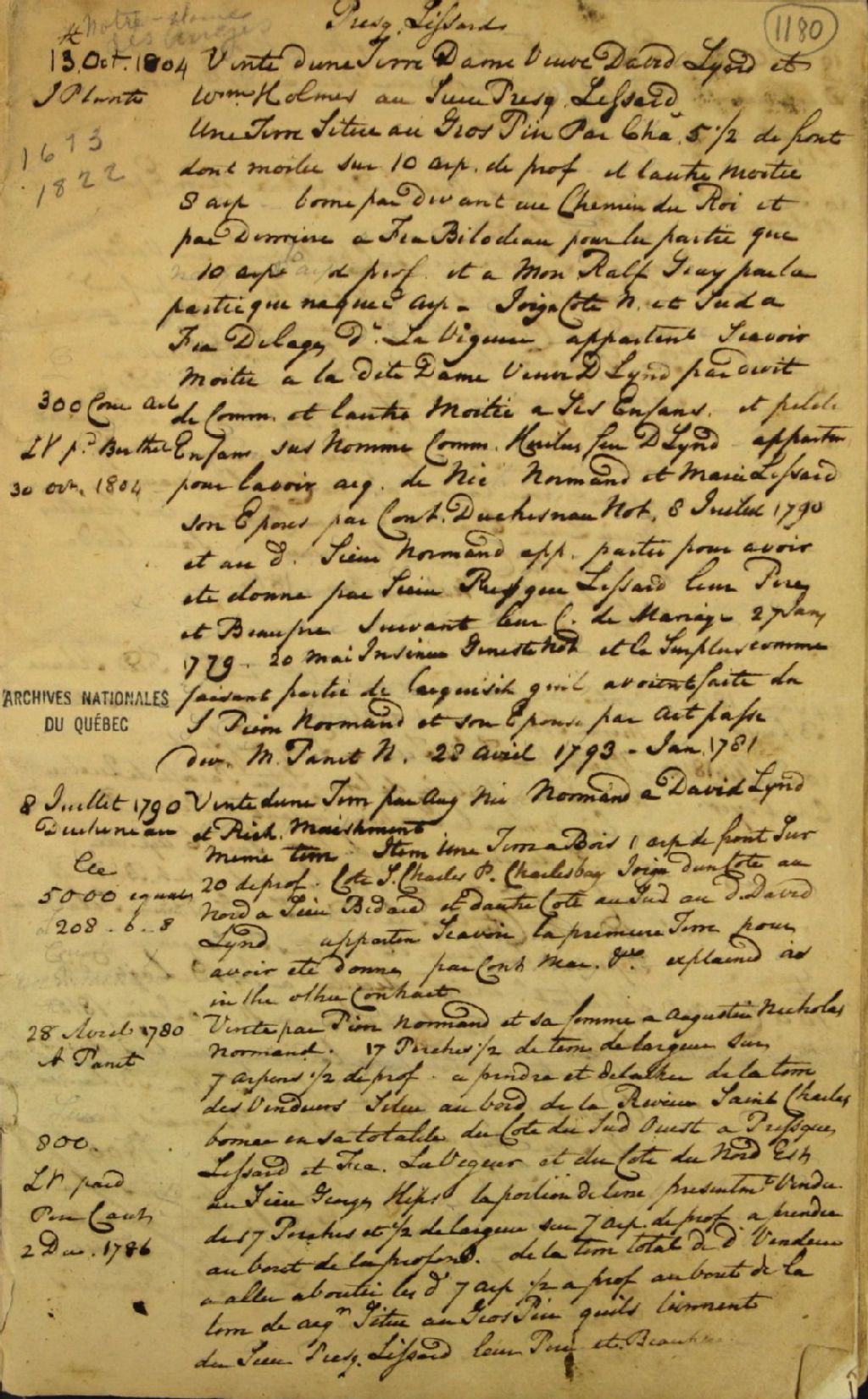 - Compilation des transations foncières dans la seigneurie Notre-Dame-des-Anges des terres de Prisque Lessard, Joseph Gagné (Gagnier), Pierre Dorion, Pierre Pépin, François Delâge dit Lavigueur, Jean-Baptiste Bernier, Charles Bertrand, Brunet (Brunette), veuve de Jean Magnan, veuve Bédard, Thomas Bédard, Laurent Normandeau, Pierre Danay (Danais), Louis Collet et Charles Bergeron