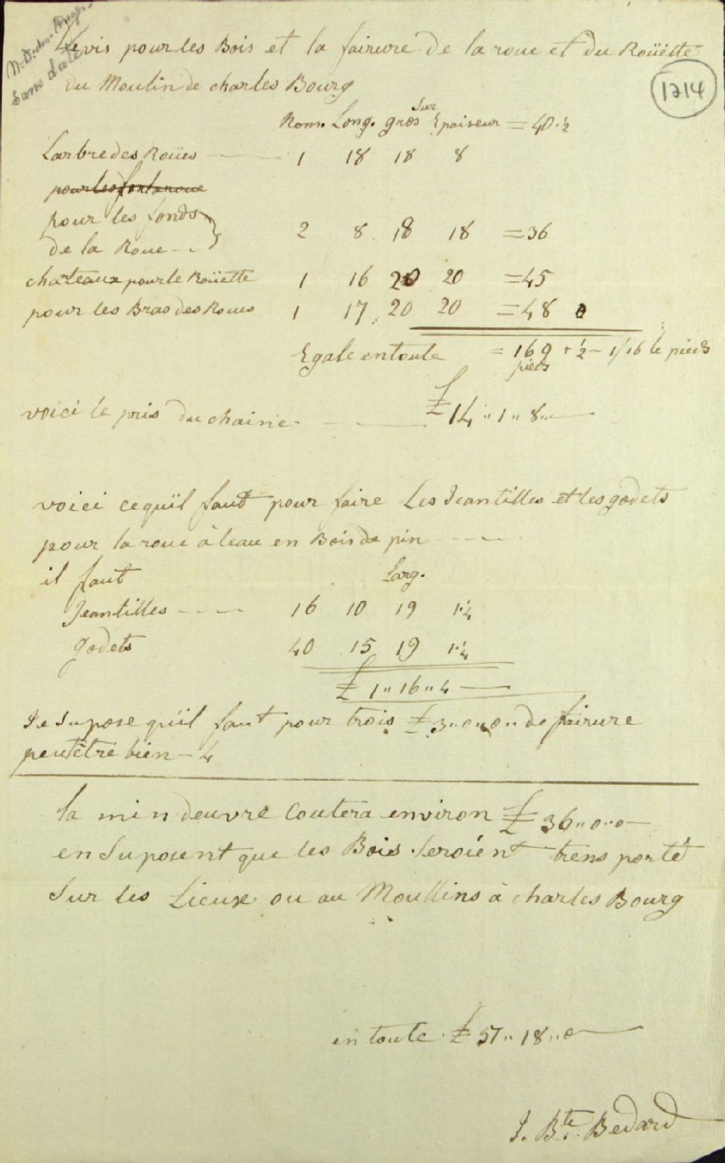 Devis pour le bois et la ferrure de la roue et du rouet du moulin à Charlesbourg, par Jean-Baptiste Bédard