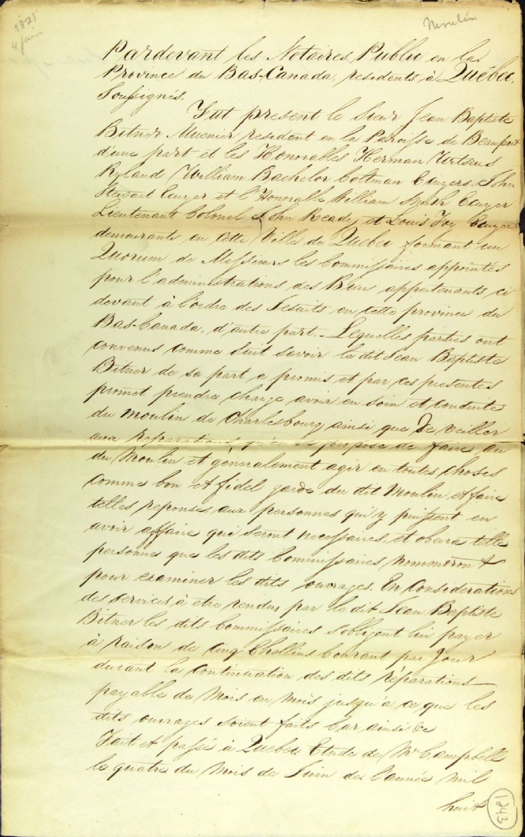 Accord entre Jean-Baptiste Bitner (Bittner), meunier résidant à Beauport, d'une part et Herman W. Ryland, William Bachelor Cottman, John Stewart et William Smith, écuyers et commissaires des biens des Jésuites d'autre part, à l'effet que Bitner doit prendre charge du moulin de Charlesbourg dans la seigneurie Notre-Dame-des-Anges, devant Campbell, notaire, 4 juin 1821, Archives nationales à Québec, Fonds Ministère des Terres et Forêts, (03Q,E21,S64,SS5,SSS5,D1243).