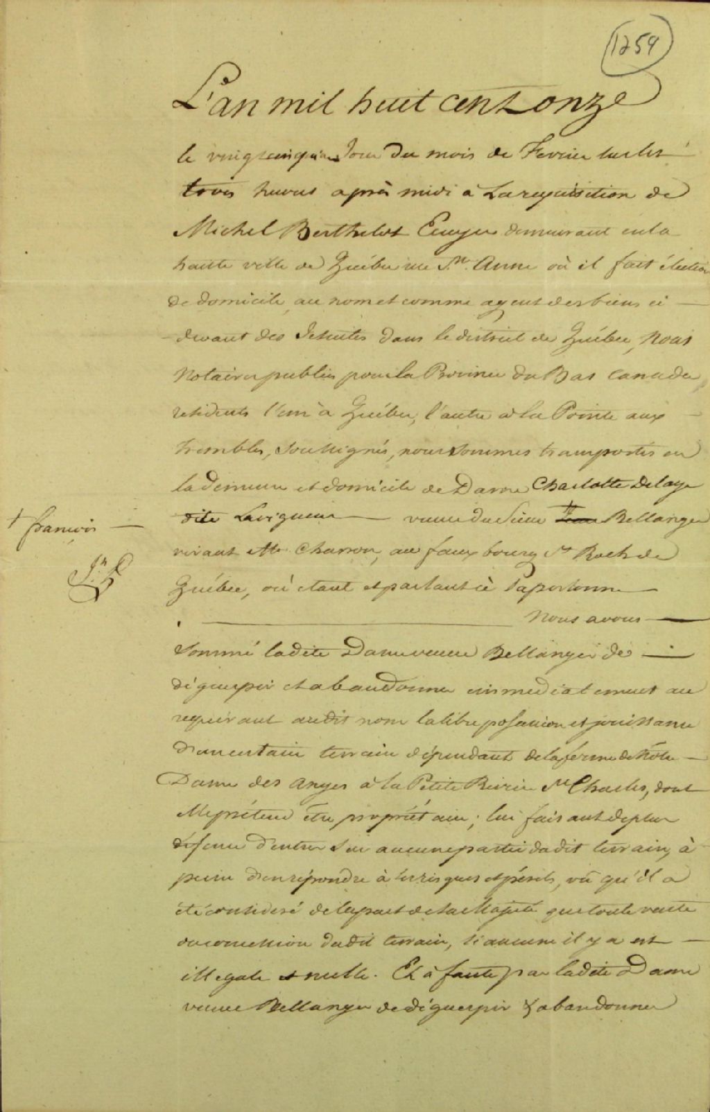 Sommation faite à Charlotte Delage dite Lavigueur veuve de François Bélanger, charron au faubourg Saint-Roch de son vivant, d'abandonner la possession d'une terre dépendant de la ferme Notre-Dame-des-Anges à la Petite-Rivière-Saint-Charles, à la réquisition de Michel Berthelot, écuyer et agent des biens des Jésuites dans le district de Québec, devant J. Planté et F.-X. Larue, notaires, 25 février 1811, Archives nationales à Québec, Fonds Ministère des Terres et Forêts, (03Q,E21,S64,SS5,SSS5,D1259).