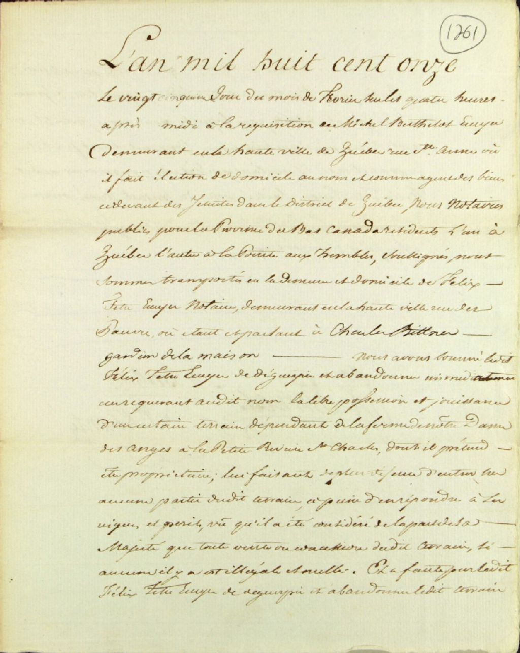 Sommation faite à Félix Têtu, écuyer et notaire demeurant à la Haute-Ville de Québec, d'abandonner la possession d'une terre dépendant de la ferme Notre-Dame-des-Anges à la Petite-Rivière-Saint-Charles, à la réquisition de Michel Berthelot, écuyer et agent des biens des Jésuites dans le district de Québec, devant J. Planté et F.-X. Larue, notaires, 25 février 1811, Archives nationales à Québec, Fonds Ministère des Terres et Forêts, (03Q,E21,S64,SS5,SSS5,D1261).