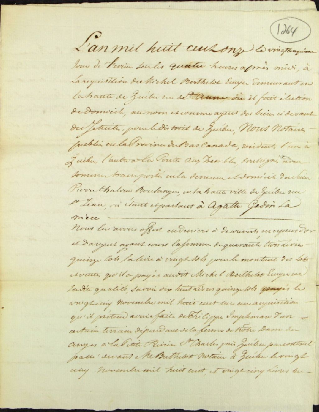 Offre d'une somme d'argent à Pierre Chalou, boulanger dans la Haute-Ville de Québec, afin d'abandonner la possession d'une terre dépendant de la ferme Notre-Dame-des-Anges à la Petite-Rivière-Saint-Charles, à la réquisition de Michel Berthelot, écuyer et agent des biens des Jésuites dans le district de Québec, devant J. Planté et F.-X. Larue, notaires, 25 février 1811, Archives nationales à Québec, Fonds Ministère des Terres et Forêts, (03Q,E21,S64,SS5,SSS5,D1264).
