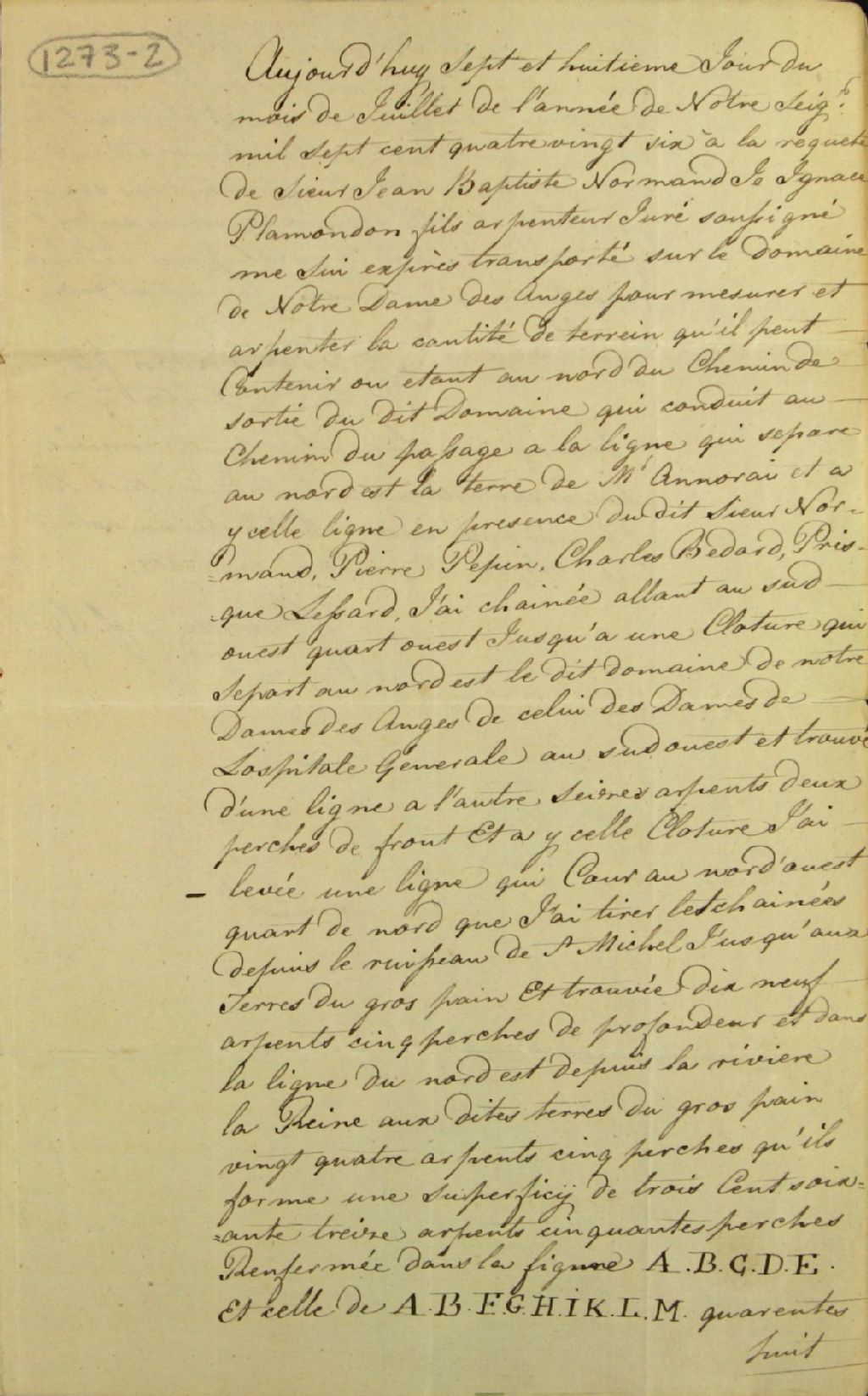 Procès-verbal d'arpentage du domaine Notre-Dame-des-Anges avec plan figuratif en couleur, effectué les 7 et 8 juillet 1786 par Ignace Plamondon fils, arpenteur juré, à la requête de Jean-Baptiste Normand, fermier au domaine Notre-Dame-des-Anges