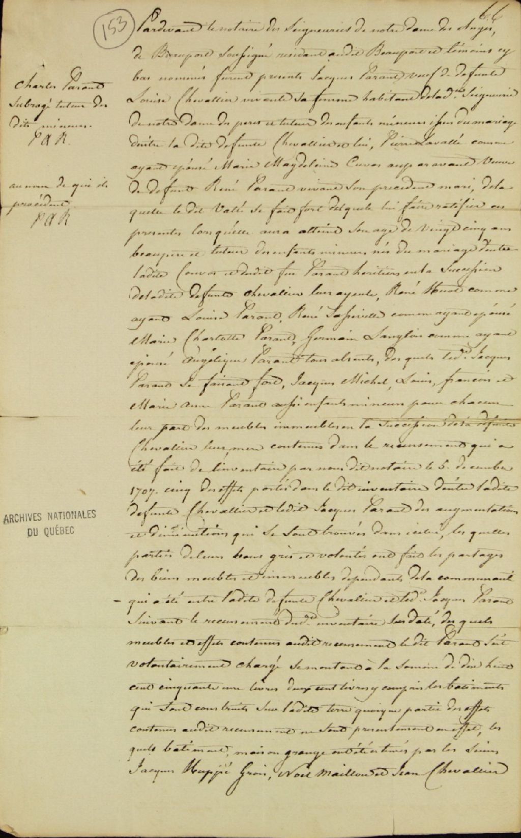 Partage des biens de la communauté qui a été entre Jacques Parent et la défunte Louise Chevalier, à la requête dudit Parent, habitant de la seigneurie de Notre-Dame-des-Anges, faisant comme tuteur des enfants mineurs issus de son mariage avec ladite défunte Chevalier, de Pierre Lavallée, comme ayant épousé Marie-Madeleine Courault (mineure), auparavant veuve de René Parent, comme beau-père et tuteur des enfants mineurs de ladite Courault et dudit défunt Parent, héritiers en la succession de ladite défunte Chevalier leur aïeule, de René Huot, comme ayant épousé Louise Parent, de René Sasseville, comme ayant épousé Marie-Charlotte Parent, et de Germain Langlois, comme ayant épousé Marie-Angélique Parent, tous absents