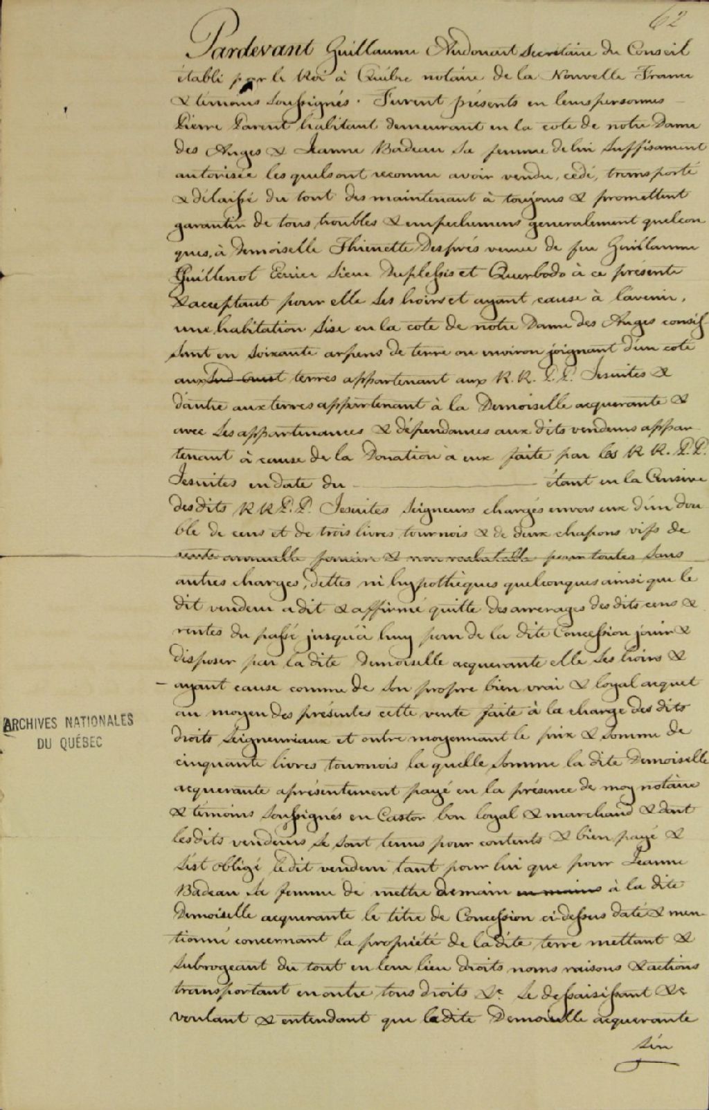 Contrat de vente d'une terre d'environ soixante arpents sise dans la côte de Notre-Dame-des-Anges par Pierre Parent, habitant demeurant en ladite côte, et Jeanne Badeau, sa femme, à demoiselle Étiennette Després, veuve de Guillaume Guillemot, écuyer, sieur de Duplessis (de Kerbotot), laquelle a versé aux vendeurs la somme de cinquante livres tournois en castor bon, loyal et marchand et la somme de trente livres tournois pour des épingles