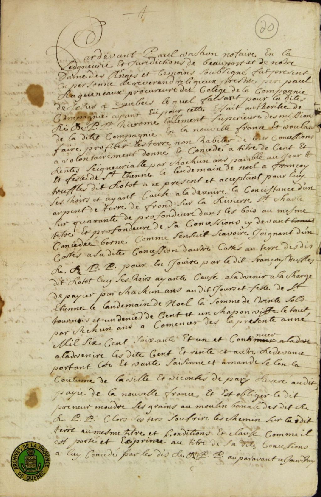 Acte de concession d'un arpent de terre de front sur la rivière Saint-Charles sur quarante arpents de profondeur dans les bois par les Pères de la compagnie de Jésus, pour la somme de trente sols tournois, un denier de cens et un chapon [coq] vif payables au jour de la fête de Saint-Étienne le lendemain de Noël, à François Trefflé dit Rotot, par-devant Paul Vachon, notaire en les seigneuries de Beauport et de Notre-Dame-des-Anges