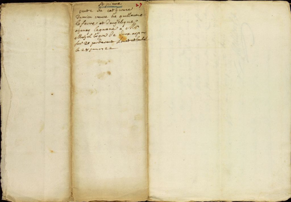 Contrat de vente de deux arpents de terre de front sur vingt arpents de profondeur situés au village de Saint-Pierre par Catherine Damien, veuve de Guillaume Lefebvre, et Angélique Chenay dit LaGarenne, fille majeure demeurant en la ville de Québec, à Monseigneur Michel Bégon, chevalier, seigneur de LaPicardière, Murbelin et autres lieux, conseiller du Roi en ses Conseils et au Parlement de Metz, intendant de justice, police et finances, demeurant au palais de Québec