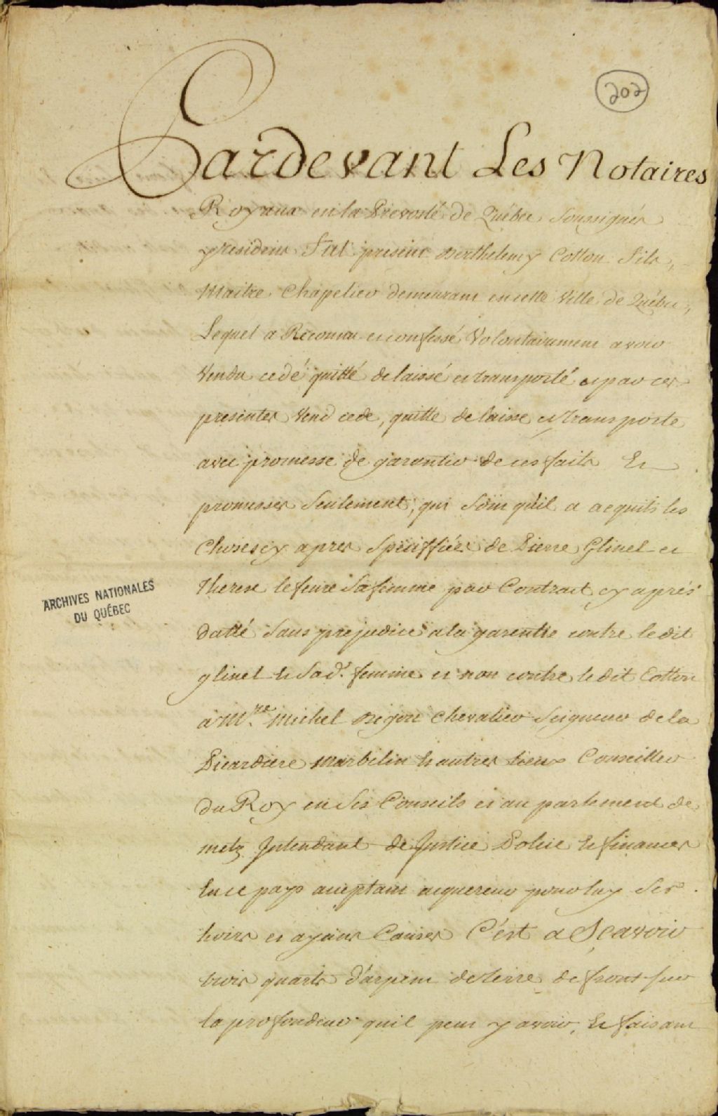Contrat de vente d'une terre située au village de Saint-Pierre en la seigneurie de Notre-Dame-des-Anges par Barthélemi Coton fils, maître chapelier demeurant en la ville de Québec, à Monseigneur Michel Bégon, chevalier, seigneur de LaPicardière, Murbelin et autres lieux, conseiller du Roi en ses Conseils et au Parlement de Metz, intendant de justice, police et finances, 5 juillet 1722, Archives nationales à Québec, Fonds Ministère des Terres et Forêts, (03Q,E21,S64,SS5,SSS5,D202).