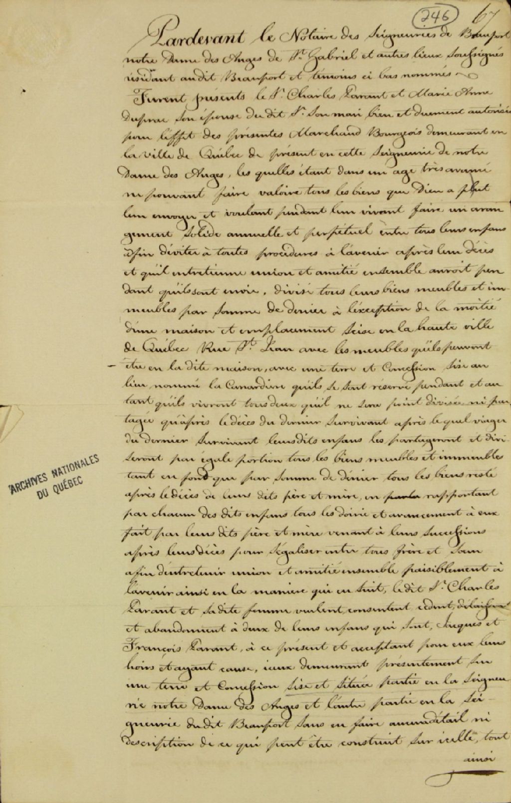 Partage et cession des biens meubles et immeubles appartenant au sieur Charles Parent, marchand bourgeois demeurant en la ville de Québec, de présent en la seigneurie de Notre-Dame-des-Anges, et à Marie-Anne Duprac, son épouse, ces derniers étant très âgés et voulant de leur vivant conclure un arrangement solide, annuel et perpétuel entre tous leurs enfants afin qu'ils entretiennent union et amitié ensemble après leur décès, par-devant Duprac, notaire