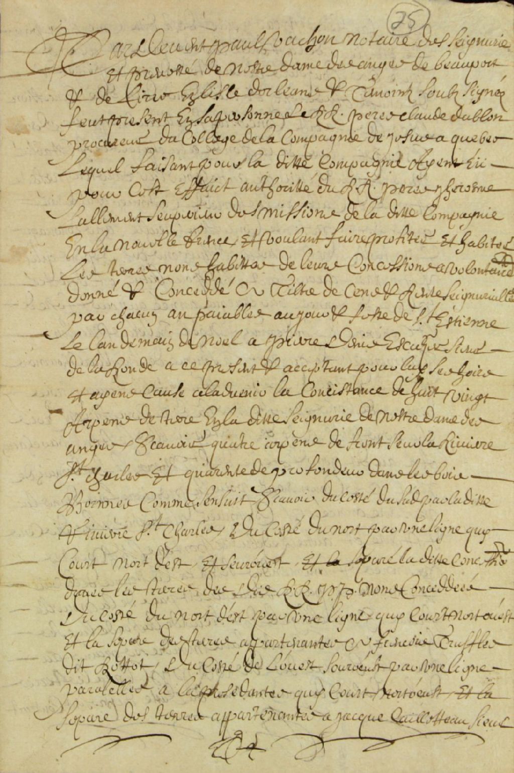 Acte de concession de quatre arpents de terre de front sur la rivière Saint-Charles sur quarante arpents de profondeur dans les bois par les Pères de la Compagnie de Jésus à Pierre Denis, écuyer, sieur de La Ronde, moyennant la somme de cinq livres tournois de bail, trois deniers de cens et trois chapons [coqs] vifs payables chaque année au jour de la fête de Saint-Étienne le lendemain de Noël, par devant Paul Vachon, notaire des seigneuries de Notre-Dame-des-Anges, de Beauport et de l'Île d'Orléans
